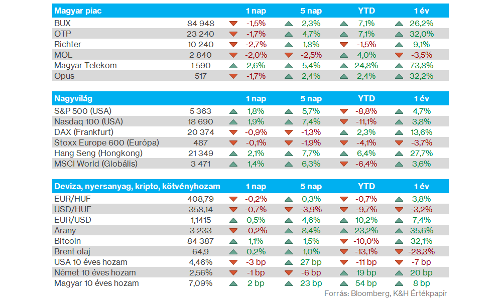 Nemzetközi piac: Az idei év legjobb hetét zárta az S&P 500 index, habár ehhez szükség volt a nagyobb visszaesésre, majd a múlt hét szerdán látott hatalmas mértékű emelkedésre is. Így látható, hogy a volatilitás továbbra is fennáll a piacon, nagy mozgások mutatkoznak, a vámpolitikával kapcsolatosan is újabb és újabb fejlemények látnak napvilágot, ez pedig a befektetők körében is növelheti a bizonytalanságot. A határidős indexek egyébként pluszokat jeleznek előre, így ezt a hetet is emelkedéssel kezdhetik a piacok, Európában is jobb hangulat mutatkozik a pénteki gyengébb zárást követően.