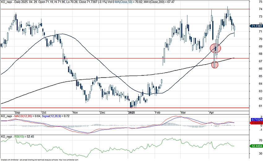 A napi grafikonon jól látható a Coca-Cola idei felülteljesítése, aminek egyik fő oka a februárban kijött pozitív tavalyi utolsó negyedéves jelentése volt. A kimagasló eredményeket követő nagy lendületben az árfolyam új csúcsot is döntött, ami azóta ellenállásként szolgálhat 74 dollár körül. A vámbejelentések után az árfolyam beesett az 50 és 200 napos mozgóátlaga alá is, azonban könnyedén visszajött a 70 dollár feletti szintekre, így a 200 napos mozgóátlag továbbra is támaszként szolgálhat az árfolyam számára. Amennyiben ezt letörné, 60,5 dollár körüli szint ígérkezik tartósabb támaszszintnek, amely egy éves mélypontnak számít. Az RSI semleges tartományokban jár, az MACD sem mutat egyértelmű jelzést.