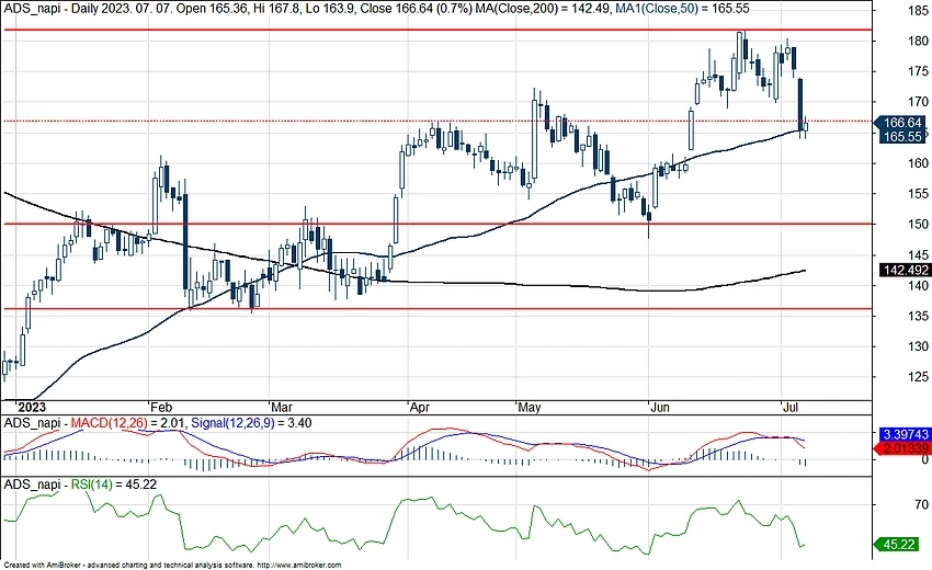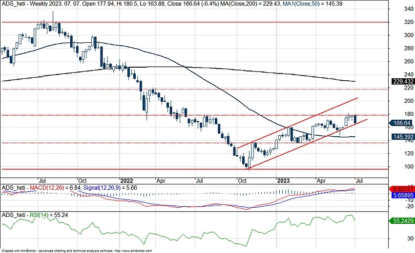 Védelem tekintetében fontos szerep hárulhat az 50 napos mozgóátlagra, hiszen a júniusi áttörést követően nem esett vissza ez alá az árfolyam, továbbá jelenleg is jól tartja magát a részvény, így felülteljesítő tud lenni a német piacon. Lejjebb még a 150 eurós szintekre érdemes tekinteni, nagyobb bajban ez szolgálhatna menedékként a részvény számára.