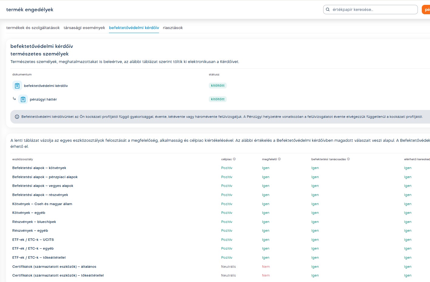 - Befektetővédelmi kérdőív kitöltése
