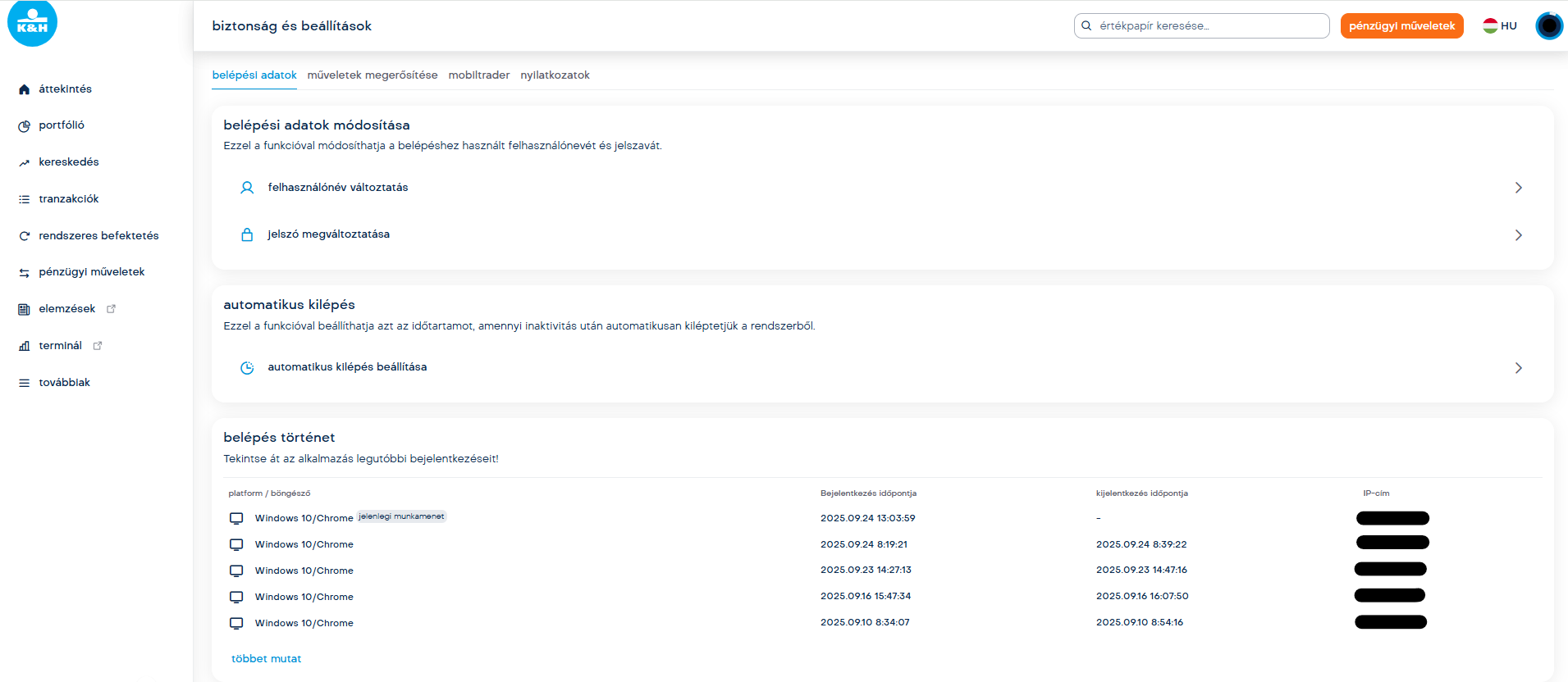 A K&H webtrader felületén, a jobb felső sarokban található “Fiók beállítások” alatt, a “biztonság és beállítások” menüponton belül meg tudod tekinteni az alkalmazás legutóbbi bejelentkezéseit.
