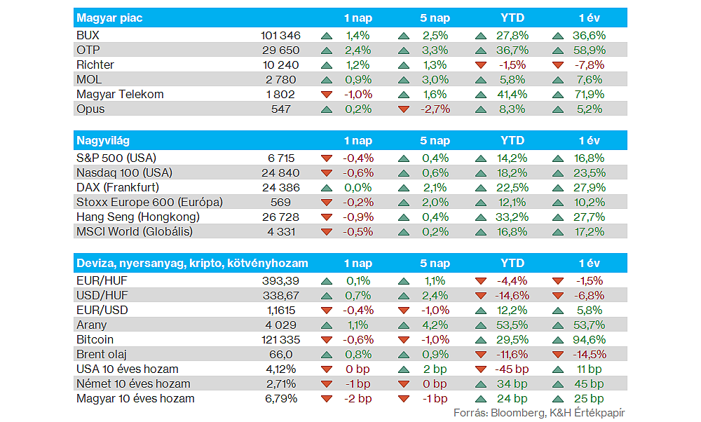 Magyar piac: Tegnap látható erősödésre volt képes a magyar piac, így a BUX index 101 ezer pont felett zárt. A blue chipek között az OTP vezette az emelkedést, több mint 2 százalékos pluszban zárt a bankpapír. Az OTP emelkedésében segíthetett az is, hogy az HSBC elemzője 37 500 forintra emelte a részvényre vonatkozó célárát. Emellett a Richter és a Mol is javítani tudott a gyengébb hétfői nap után, ugyanakkor a Telekom részvénye egyelőre nem találja az erőt.