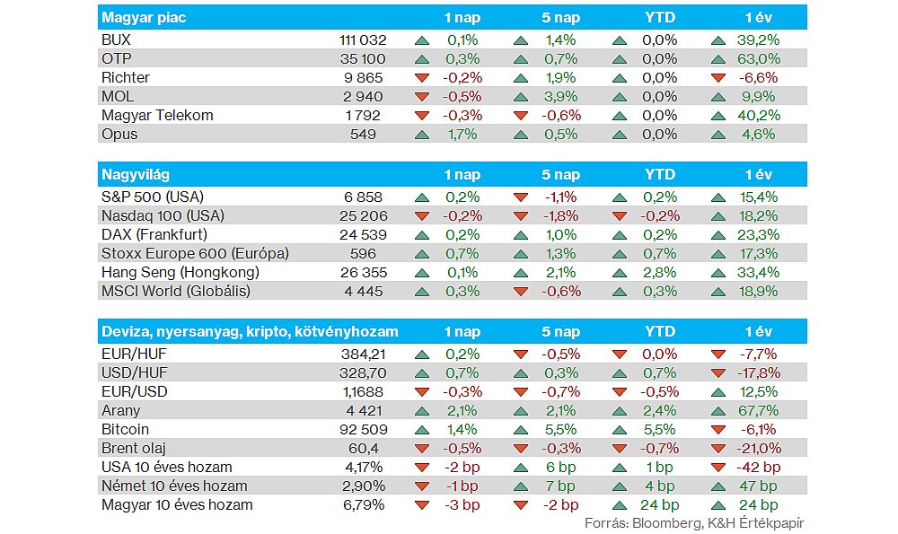 Magyar részvények: A mai nap lesz az első kereskedési nap a 2026-os évben a hazai piacon, a BUX pedig 111 ezer pont környékén indíthatja meg az idei évet. Az utóbbi hetekben egyébként főleg az OTP szerepelt erősen, a bankpapír 35 ezer forint fölé tudott emelkedni, segítve ezzel a hazai piacot is, de a Telekom is végül 1800 forint közelébe tudott erősödni a november közepi gyengébb teljesítmény után.