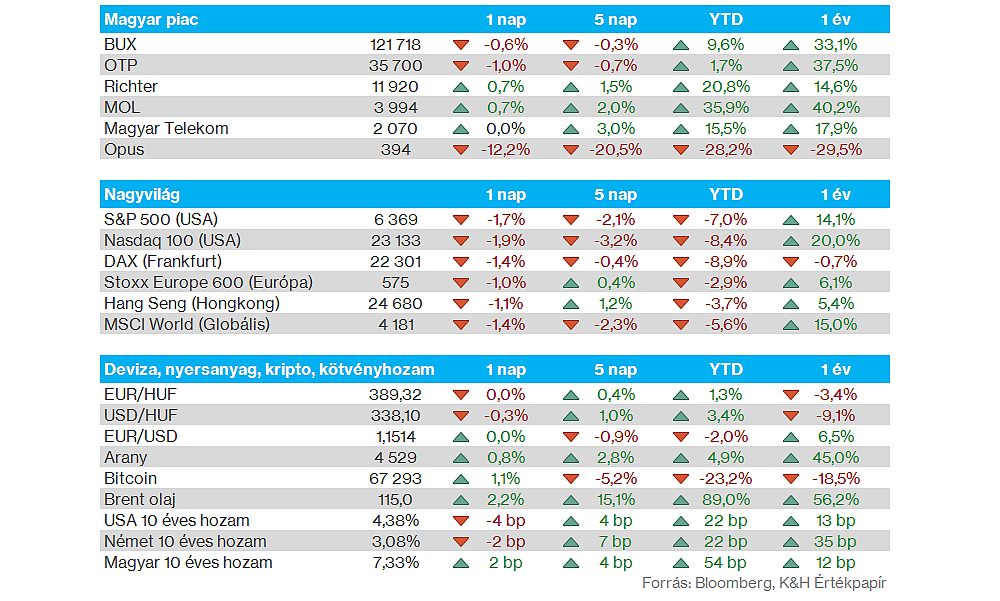 Magyar piac: Gyengébb hangulatban telt a pénteki kereskedés a magyar piacon is, így a BUX index 121 700 pont közelében zárta a hetet. A blue chipek közül a Richter, illetve a Mol mutatott kisebb erőt, miközben az OTP csökkenéssel zárta a hetet, a Magyar Telekom pedig nem mutatott érdemi elmozdulást.