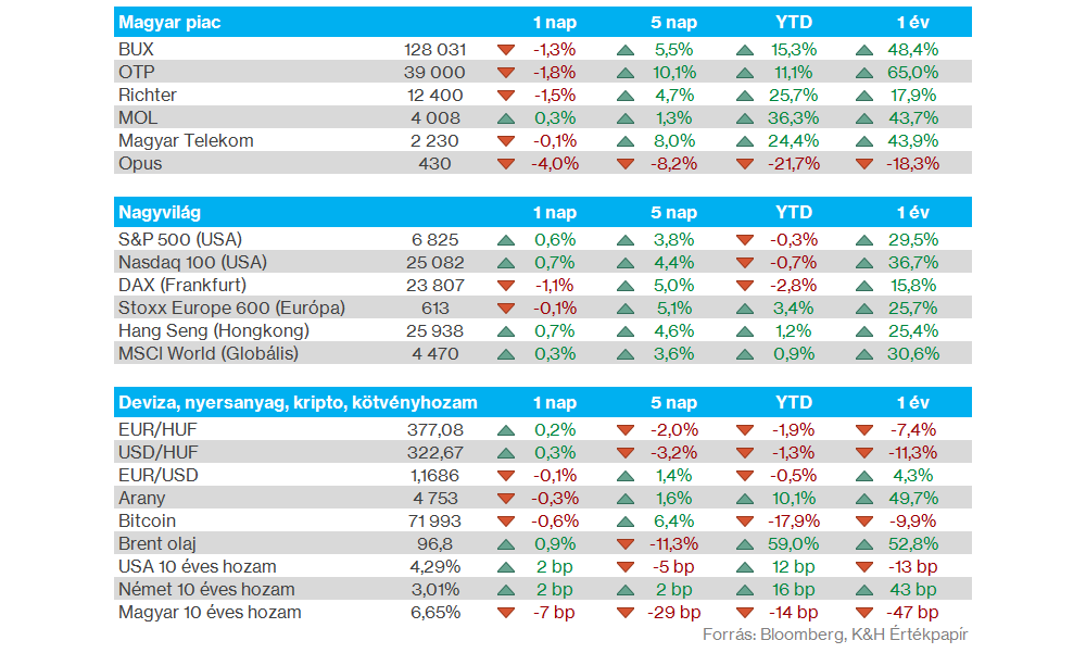 Magyar piac: A bizonytalan hangulat közepette nem mutatott nagy erőt tegnap a BUX index sem. Az 1 százalék feletti csökkenés után végül 128 ezer pont körül jár a BUX, a nagyobb papírok közül az OTP és a Richter is 1,5 százalék felett gyengült. Valamivel jobban tartotta magát a Mol és a Magyar Telekom is, de a telekomcég sem tudott végül pozitívan zárni.