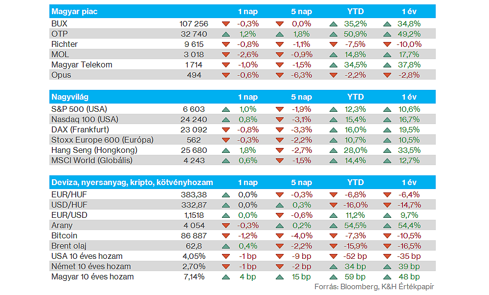 Nemzetközi piacok: Javulóban a hangulat a tőzsdéken, a határidős indexek alapján óvatos emelkedés mutatkozhat az amerikai piacokon, miközben Európában is pozitív nyitás várható. A befektetők kedvezően fogadták a híreket, miszerint megnőtt az esélye a decemberi kamatvágásnak, valamint az AI-kapcsolt vállalatok körüli értékeltségi félelmek is enyhültek valamelyest, így a VIX index kapcsán is érdemi visszaesés játszódott le. A múlt hét során egyébként a techpapírok és a ciklikus fogyasztási javak szektora húzta lefelé az amerikai tőzsdét, miközben a defenzívebb papírok, az egészségügyi szektor felülteljesítő tudott maradni.