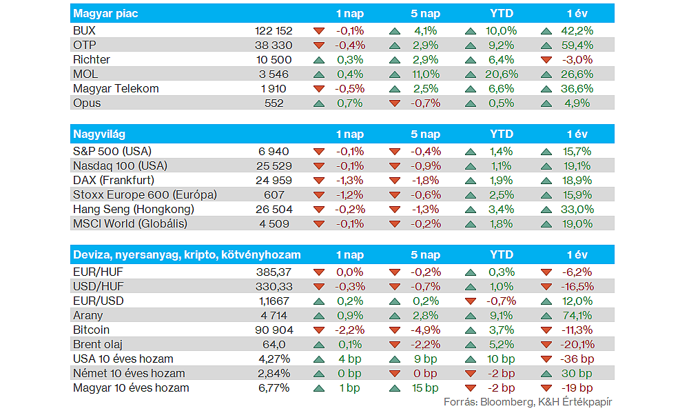 Nemesfémek: A gyengébb piaci környezetben felülteljesítők maradtak a nemesfémek a tegnapi nap folyamán, így az arany 4700 dollár fölé, míg az ezüst 94 dollár fölé emelkedett mostanra. Év eleje óta egyébként az ezüst már 31 százalék feletti plusznál jár, bár ehhez magasabb volatilitás is párosul. Az arany némileg mérsékeltebb emelkedést produkál idén eddig, de a 9 százalékos javulásával így is felülmúlja a főbb amerikai indexek teljesítményét.