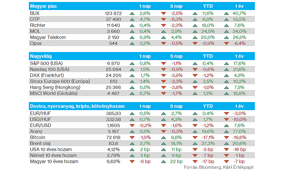 Magyar piac: Javuló teljesítményt nyújtott tegnap a hazai piac, amiben az OTP 4,7 százalékos emelkedése jelentős szerepet játszott. A befektetők egyébként a holnap hajnalban érkező negyedik negyedéves gyorsjelentésre is várhatnak a nagybank kapcsán. Az OTP mellett tegnap a többi blue chip is emelkedéssel tudta zárni a kereskedést, a Mol és a Richter tekintetében 0,4 százalék körüli elmozdulás mutatkozott, míg a Magyar Telekom közel 1 százalékos pluszba tudott kerülni.