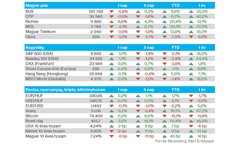 Nemzetközi részvénypiacok: Javítani tudtak a múlt heti gyengébb teljesítményeket követően a főbb részvényindexek tegnap, Európában mérsékelt pluszok mutatkoztak, míg az amerikai S&P 500, illetve a Nasdaq 100 index 1 százalék feletti emelkedést produkált. A befektetők változatlanul a közel-keleti eseményekre fókuszálhatnak, de a héten a Fed és az EKB kamatdöntésére is figyelhetnek, valamint a holnap esti Micron gyorsjelentés is nagyobb figyelmet kaphat. A határidős indexek gyengébb mozgásokat vetítenek előre ma reggel Amerikában és Európában is.