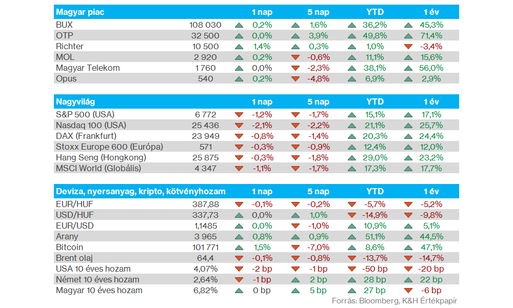 Magyar piac: Kisebb pluszban zárt végül tegnap a hazai piac, de ebben a környezetben relatív ez is inkább jobb szereplésnek számított, továbbá a BUX még mindig 108 ezer pont körül mozog. A blue-chipek közül a Richter mutatott felülteljesítést, ezzel 10 500 forinton tudott zárni, de végül a Mol is enyhe emelkedést könyvelhetett el.