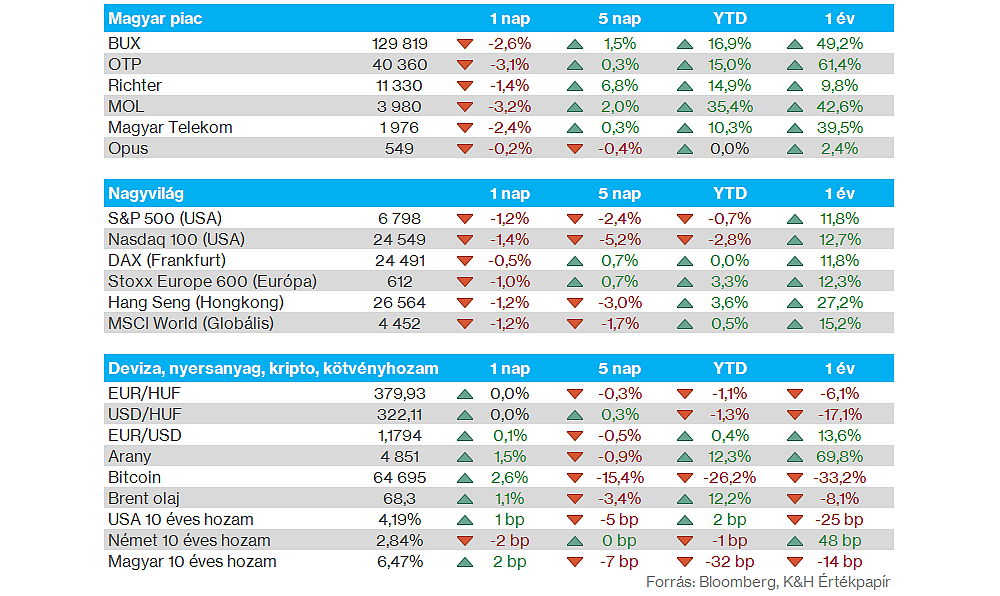 Magyar piac: A gyengébb nemzetközi hangulat közepette nagyobb csökkenés volt látható a magyar piacon is, így a BUX index tegnap 130 ezer pont alá tért vissza. A blue chipek közül 2–3 százalék körüli mínuszban zárt az OTP, a Mol és a Magyar Telekom is, emellett a Richter részvénye is több mint 1 százalékos csökkenéssel fejezte be a tegnapi kereskedést.