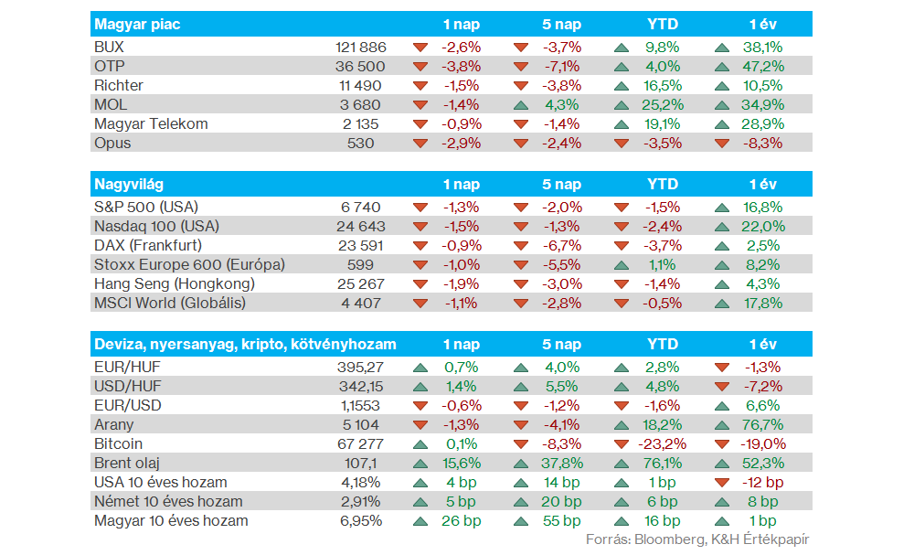 Nemzetközi piacok: A hét utolsó kereskedési napján sem szerepeltek jól a nemzetközi piacok, a DAX végül 0,9 százalékkal gyengült, míg az S&P 500 1 százalék feletti mínuszba csúszott. Az előző héten a közel-keleti események hatására így mínuszok uralkodtak, de amíg a DAX 7 százalék körüli esést mutatott be egy hét alatt, addig az S&P 500 csak 2 százalék körüli mínuszt halmozott fel, vagyis voltak eltérések a nagyobb indexek között is. A nagyobb fokú bizonytalanság továbbra is szemmel látható a piacokon, a határidős indexek is visszaeséseket vetítenek előre, így Európában több határidős index is 2 százalék feletti mínuszban tartózkodik ma reggel. A befektetők így a hét során változatlanul a közel-keleti események híreire fókuszálhatnak, továbbra is bizonytalanság uralkodhat a piacokon, a VIX index értéke is tavaly április óta nem látott szintekre emelkedett.