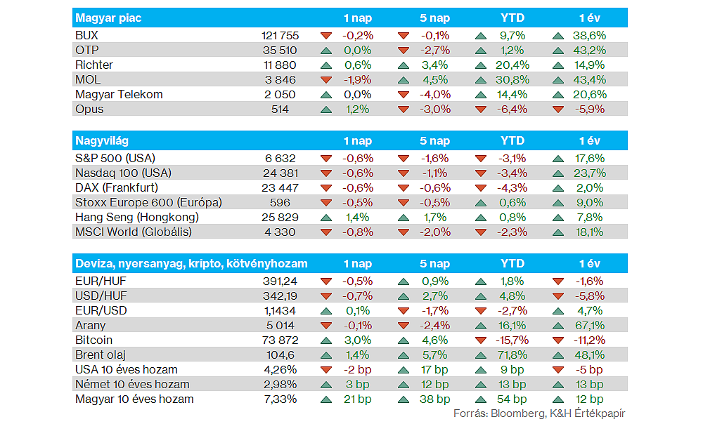 Nemzetközi részvénypiacok: Bár az előző hetet valamivel jobban kezdték a részvénypiacok, összességében a hét második felében inkább negatív hangulat uralkodott. A Nasdaq 100 ezzel a 24 400 pontos szintek közelébe csökkent vissza, de az S&P 500 index is bőven 6700 pont alatt jár. Az amerikai indexek így 2-3 százalékos mínuszokat mutatnak eddig márciusban, míg a DAX kapcsán 7 százalékos visszaesés látható, miután az előző héten sem voltak jó formában az európai piacok. A határidős indexek egyébként kedvező nyitásokat vetítenek előre a hét első kereskedési napjára.