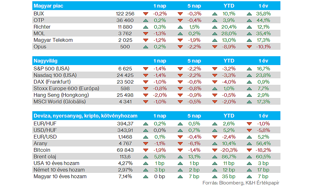 Nemzetközi részvénypiacok: Az olajárak emelkedését követően a hangulat sem volt túl erős a nemzetközi részvénypiacokon. A DAX végül 1 százalékos csökkenést ért el, így a hét első felében látott pluszokat is letörölte, míg az amerikai indexek még gyengébben teljesítettek, ráadásul a határidős indexek sem mutatnak erőt, így továbbra is bizonytalan piaci hangulat rajzolódik ki a nemzetközi részvénypiacokon.