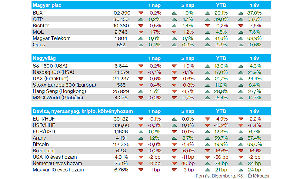 Nemzetközi piacok: Negatívan teljesítettek a főbb részvénypiacok tegnap, de napon belül összességében az amerikai tőzsdék már javítani tudtak, az S&P 500 így csak 0,2 százalékos mínuszban zárt. Látható volt a technológiai szektor alulteljesítése, míg a defenzívebb papírok felülteljesítettek, ez összességében nem a legkedvezőbb üzenetet jelenti a befektetők számára, de az S&P 500 azért így is 1,5-2 százalékos közelségben van a pár nappal ezelőtti csúcsaihoz képest. A DAX szintén mínuszban zárt, napközben érintve az 50 napos mozgóátlagot is, technikailag viszont pozitív, hogy délután már jobban szerepeltek a német részvények. A gyorsjelentési szezon közben kezdetét vette, így a vámháború körüli fejlemények mellett ma a Bank of America és Morgan Stanley jelentéseket is figyelhetik a befektetők. A határidős indexek alapján Európában nagyobb emelkedéssel indulhat a mai kereskedés, de az amerikai indexek is 0,2-0,5 százalékos pluszban állnak.