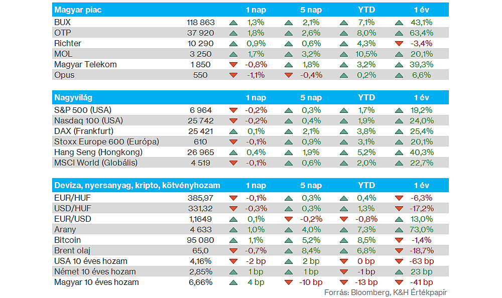 Magyar piac: Tovább folytatta jó szereplését a magyar piac tegnap is, így a BUX index a 118 ezer pontos szinteket áttörve zárt 1 százalék feletti pluszban, miközben az OTP is újabb csúcsszinteket tudott kijelölni. A magyar bankpapír mellett a Mol is új lendületet vett, de a Richter is pozitív teljesítményt produkált. A vezető részvények közül egyedüliként a Telekom tűnt lemaradónak, bár jelentős mértékű visszaesés itt sem volt látható.