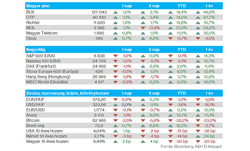 Nemzetközi piacok: Gyengélkedéssel indult a kereskedés a héten az amerikai piacokon, miközben folytatódott a nagy kapitalizációjú cégek és a techvállalatok gyenge teljesítménye is, így az S&P 500 index is 1 százalék feletti mínuszban zárt. A bizonytalanság továbbra is nagy a vámok, illetve az AI-forradalom körüli hírek kapcsán, így a VIX index is emelkedés jeleit mutatta, emellett a befektetők a héten az Nvidia gyorsjelentésére is várhatnak, amely a chipgyártók számára is fontos indikátor lehet. Európában idén eddig kedvezőbb teljesítmények bontakoztak ki szemben Amerikával, így a szélesebb európai piacot lefedő STOXX 600 index 6 százalékos pluszban áll év eleje óta. A határidős indexek egyébként kisebb pluszokat jeleznek előre, így kedvezőbb hangulatban indulhat a mai kereskedés.
