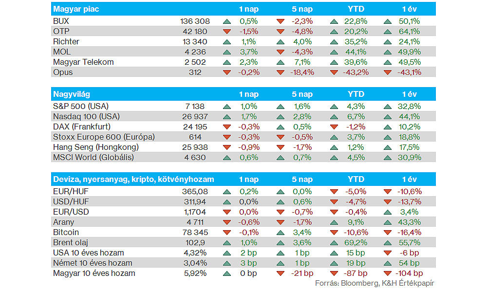 Nemzetközi piacok: Vegyes képet mutattak tegnap a nemzetközi piacok, míg az amerikai indexek látható mértékben erősödni tudtak, addig a DAX 0,3 százalékkal csökkent. Nem segített az európai piacoknak, hogy a német gazdaság a friss várakozások alapján csak 0,5 százalékkal növekedhet idén, valamint 2027-ben is csak 0,9 százalékos lehet a bővülés mértéke a német gazdasági minisztérium szerint. A határidős indexek negatív nyitást jeleznek előre Európa-szerte, de az amerikai piacokon is gyengébb hangulat figyelhető meg.
