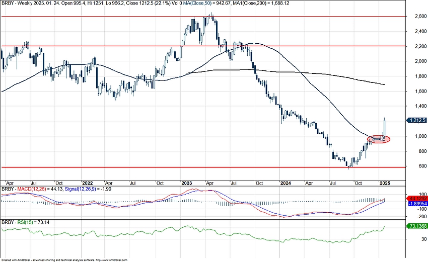 A piaci szereplők kitörő optimizmussal fogadták a ma reggeli Burberry jelentést, a részvény így több mint 10 százalékos ugrással kezdte a kereskedést. Látható, hogy a lokális mélypontját tavaly szeptemberben érintette az árfolyam, ezt követően tudott újra emelkedő trendbe kerülni. Decemberben már az 50 hetes mozgóátlagot is áttörte a Burberry, de az igazi fellendülés ezen a héten volt látható, 10 font közeléből 12 fontra ugrott az árfolyam. Ezzel sikerült tavaly januári szintekig visszakapaszkodnia a részvénynek, ugyanakkor a 22-26 fontos szintektől még messze elmarad az árfolyam.