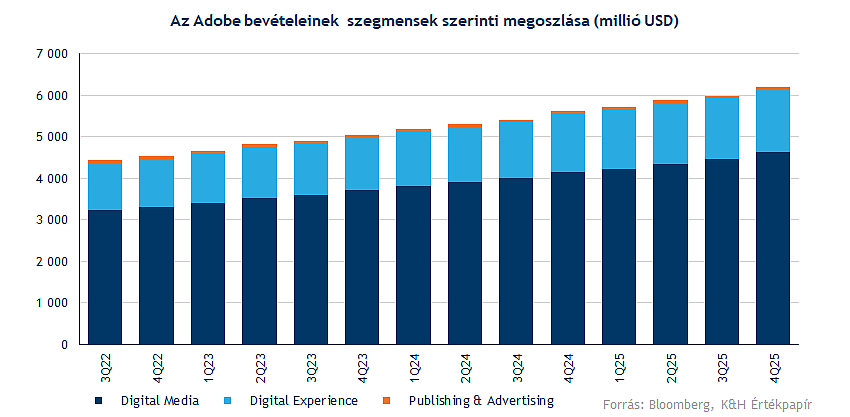 Szegmensek tekintetében a Digital Media üzletág emelkedik ki, hiszen a bevételek jelentős hányada itt képződik, a vállalat ismertebb termékei is ebbe a szegmensbe tartoznak, többek között a Photoshop, Acrobat és sok más kreatív szoftver is. A kedvező kilátásokat támasztja alá, hogy a cég egyik legfontosabb mutatója, az ARR, vagyis az ismétlődő bevételek mértéke is sokat javult az év során, valamint a következő üzleti évre is két számjegyű bővülés mutatkozhat, ebben a Digital Media erőteljes ügyfélbázis-növekedése, és a folyamatosan fejlesztés alatt álló platformok és termékek nyújtanak segítséget.