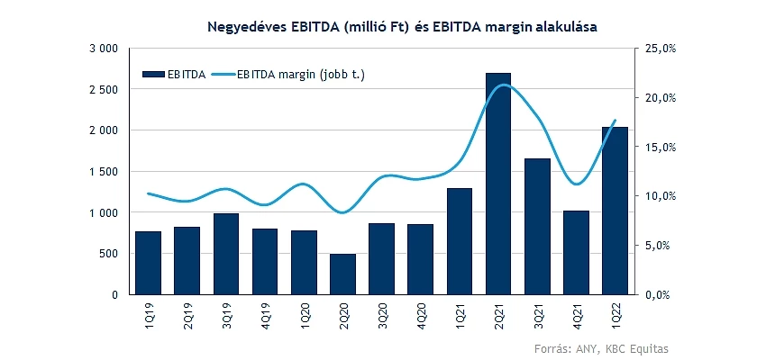 A közel 18 százalékos EBITDA hányad is javulást jelent az egy évvel korábban szintekhez képest. A 2 milliárd forint feletti EBITDA eredmény mind éves, mind negyedéves alapon javulást mutat, csupán egyszer tudott ennél jobb eredményt felmutatni a vállalat.