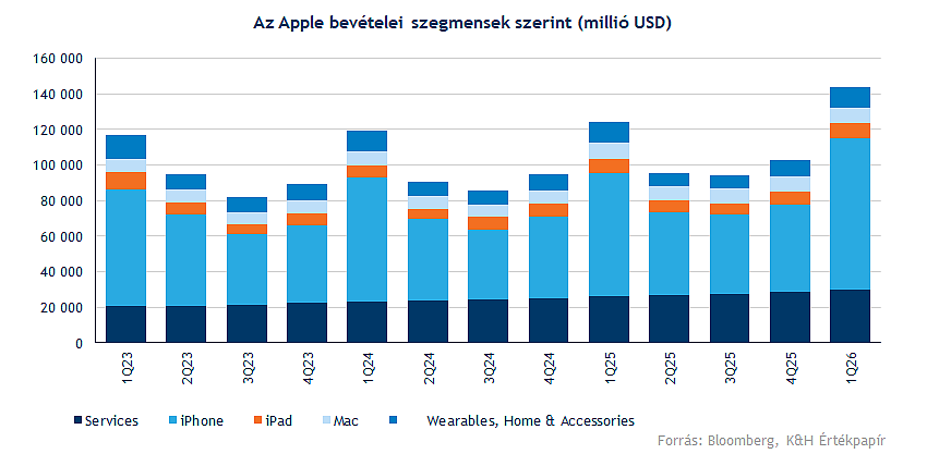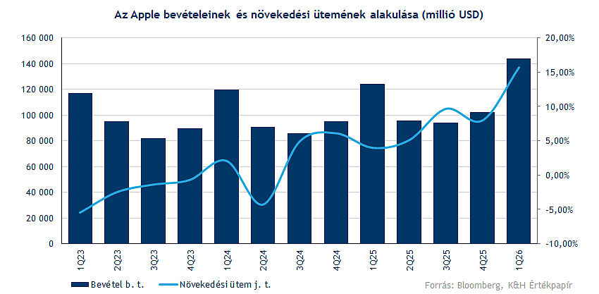Az Apple számára kulcsfontosságú ünnepi időszak is kedvezően alakult, amely segítséget nyújthat a szeptemberben végződő 2026-os üzleti év profitabilitásának javulásához. A karácsonyi negyedév bevételei egyébként éves szinten 16 százalékkal nőttek, közel 144 milliárd dollárt elérve ezáltal, amely könnyedén haladta meg a piaci által támasztott 138,4 milliárdos várakozást. EPS szintjén is folytatódott a növekedés, így 2,84 dolláros eredményt realizált a társaság, meghaladva a 2,67 dolláros várakozást.