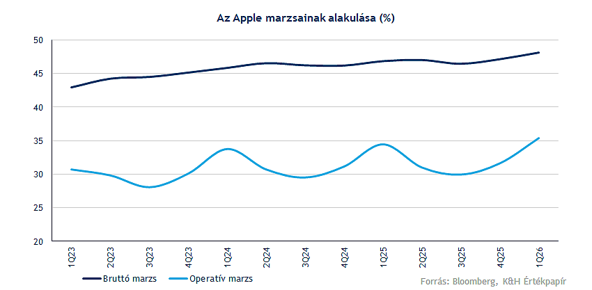 Nagy aggodalomra azért egyelőre nincs ok, hiszen a vezetőség szerint a memóriaalkatrészek drágulása ellenére is a bruttó marzs 48-49 százalék körül maradhat a jelenlegi negyedévben. Emellett optimista bevételelőrejelzést tett közzé a társaság, a negyedéves bevétel így 109 milliárd dollár körül alakulhat, amely az elemzői konszenzusnál is optimistább várakozást jelez. Az erőteljes bevételnövekedésben az iPhone teljesítménye meghatározható maradhat, piaci becslések szerint 2026-ban 246 millió, 2027-ben pedig körülbelül 262 millió darab értékesítés mutatkozhat globálisan.