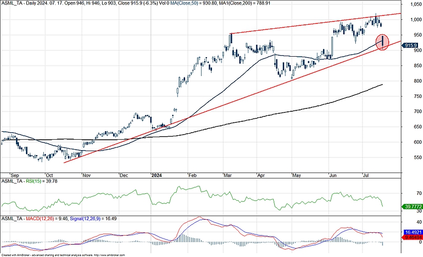 Nem jött jókor a jelentés az ASML árfolyama számára, mivel a részvény 6 százalékos mínusszal reagált a reggeli hírekre, míg délutánra még nagyobb esést szenvedett el. Látni kell, hogy ezzel az 50 napos mozgóátlagáig csúszott vissza a papír, ami jelenleg 930 euró körül mozog. Kétségkívül igaz persze, hogy remek negyedéveken van túl az ASML részvénye, valamint most is „csak” a június eleji szintekre csúszott vissza a papír.