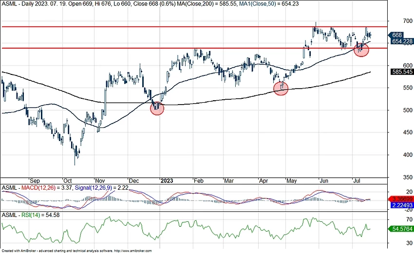 Sok panasza nem lehetett a részvényeseknek az ASML idei piaci teljesítményére, január eleje óta ugyanis 30 százalékot emelkedett a részvény árfolyama. Ez ugyan elmarad a Philadelphia Semiconductor index idei hozamától, de azt látni kell, hogy az ASML üzleti modelle miatt sokkal kevésbé a ciklikus a társaság pénzügyi teljesítménye, stabilabb árfolyamot eredményezve. Az idei emelkedésnek hála már a lélektani 700 eurós szintet is megközelítette az árfolyam, azt viszont nem tudta áttörni egyelőre. Ha sikerülne ezen a szinten is átlépnie az ASML részvényének, akár a történelmi csúcsszintet vehetné támadásba az árfolyam 760 euró környékén.