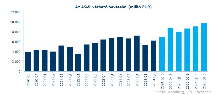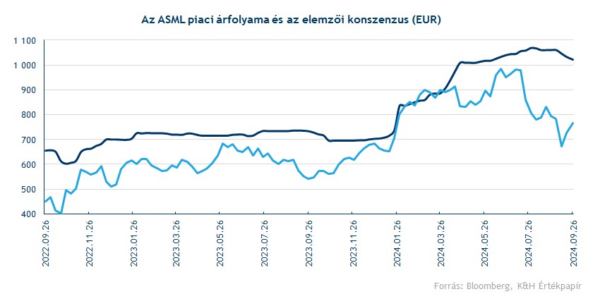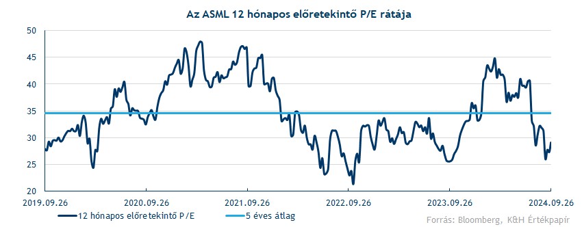 A jövő évi profitvárakozások is csak kisebb mértékben mérséklődtek, ezzel 2025-ben 29 eurós EPS-t vár a Bloomberg konszenzusa, ami még így is 60 százalékos javulást jelentene az idei évben várható profithoz képest. A piaci árfolyam viszont nagyobb korrekción esett át, így a részvény értékeltsége új idei mélypontra esett vissza. A 12 hónapos előretekintő P/E ráta már 30 alatti szintekre csökkent le, ami historikusan is alacsony szintnek számít. Viszont a jelenlegi profitnövekedés-várakozások és az ASML egyedi helyzetét is figyelembe véve akár magasabb, 35-40 körüli értékeltségi mutató is indokolt lehet.