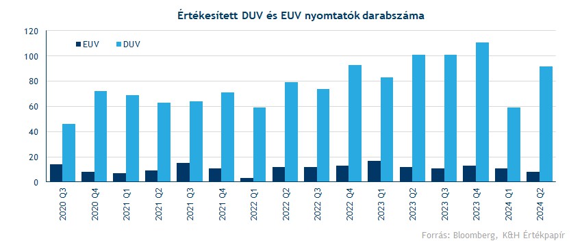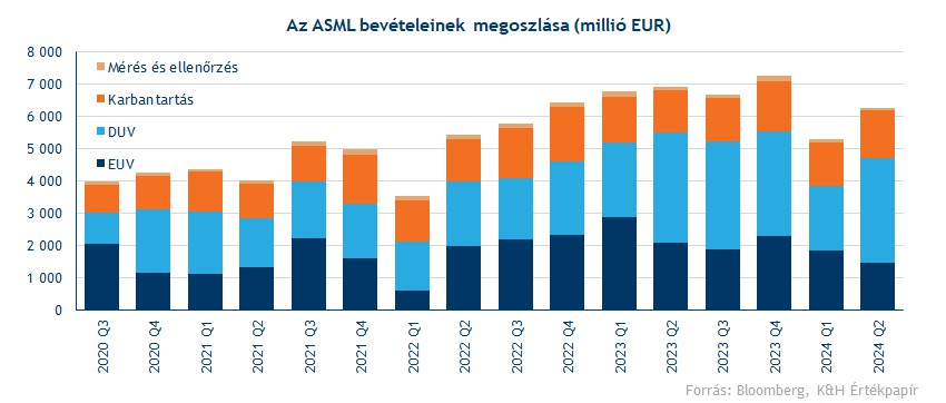 Az utóbbi években a régebbi technológiával rendelkező DUV nyomtatók esetében jelentős fejlesztések zajlottak le, és már ezekkel az eszközökkel is lehetővé vált a 40 nanométer körüli pontosság. Emellett ezeket jelentősen olcsóbb megszerezni és üzemeltetni, ezért a chipgyártók körében változatlanul népszerű opciónak számítanak. Az alábbi ábrán is látható, hogy a DUV nyomtatók eladásai már meghaladták az utóbbi egy-másfél évben az EUV nyomtatókét, bár ebben a kínai értékesítések felpörgése is szerepet játszott. Emellett az ASML minden értékesített nyomtatója mellé karbantartási szolgáltatásokat is nyújt, ami stabil bevételeket biztosít a társaság számára minden egyes negyedévben.