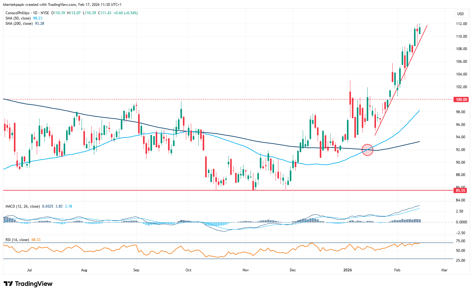 Kiemelkedően teljesít a ConocoPhillips részvénye az utóbbi időben, egy emelkedő trendvonal segíti az árfolyamot, miközben az aranykereszt is megjelent a grafikonon. A vállalat további költségcsökkentéseket jelentett be 2026-ra 1 milliárd dollár értékben, miközben a részvényesi juttatásokra továbbra is nagy hangsúly helyeződhet.