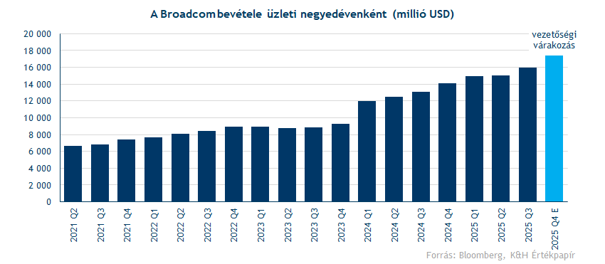 A társaság következő negyedéves jelentése december közepén esedékes, ami akár további lendületet kölcsönözhet az árfolyamnak. A jelenlegi elemzői várakozások alapján 17,4 milliárd dolláros bevétel mellett 1,86 dolláros EPS-t érhet el a jelenlegi negyedévben a Broadcom, ez 24, illetve 31 százalékos éves növekedést jelentene. A várakozások alapján tehát kitarthat a 30 százalék körüli EPS-növekedés a negyedévben, de a 2026-os üzleti évben már 40 százalék feletti EPS-növekedéssel számolnak az elemzők a Bloomberg adatai alapján.