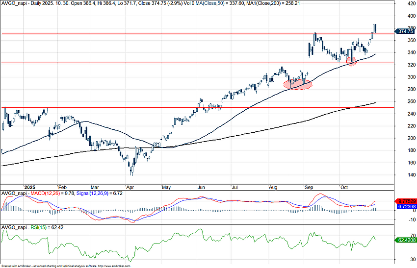 A Broadcom részvénye igen szépen teljesített az elmúlt hónapokban is, még a harmadik negyedéves eredmények közzététele előtt átvitte a lélektani 250 dolláros szintet az árfolyam, ettől a szinttől azóta már jelentős mértékben eltávolodott. A szeptemberi negyedéves jelentést követően pedig már 370 dollár környékén jelölt ki új csúcsot az árfolyam, ezt tudta ezen a héten erőteljesen áttörni a részvény. Egyelőre tehát töretlennek tűnik a Broadcom lendülete, amit az erős fundamentumok mellett a már-már eufóriára hajazó piaci optimizmus is segít. A társaság piaci kapitalizációja már az 1800 milliárd dollárt is átlépte, megelőzve ezzel a Teslát a legértékesebb vállalatok listáján. A sokat emlegetett 7 mesterlövészbe tehát már bőven beférne a Broadcom, amit egyébként is amolyan nyolcadik tagként szoktak emlegetni.