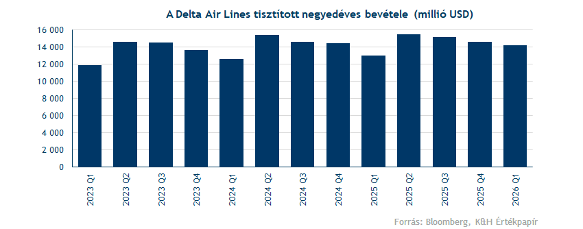 A Delta Air Lines (Delta) bevételek terén hozni tudta a várakozásokat, 2026 első három hónapjában 14,2 milliárd dolláros tisztított bevételt ért el, ami enyhén meghaladta a 14 milliárdos konszenzust. Éves szinten ez 9,4 százalékos növekedést jelent, amellyel a cég sikeresen felülteljesítette a vezetőség által korábban jelzett 7-9 százalékot.