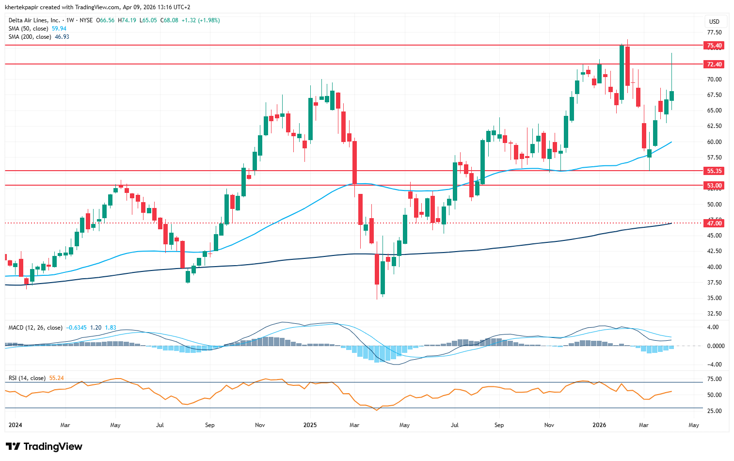 Az elmúlt heteket figyelembe véve azonban egyértelműen javuló trendben mozog a Delta árfolyama, amelynek márciusban az 50 hetes mozgóátlag nyújtott fontos támaszt. További támaszszintként az 53-55 dolláros zóna, valamint a 200 hetes mozgóátlag azonosítható 47 dollárnál. Ezzel szemben a visszapattanást követő emelkedés során a 72–75 dollár körüli csúcsszintek kerülhetnek célkeresztbe, amelyeket az árfolyam már tegnap is érintett.