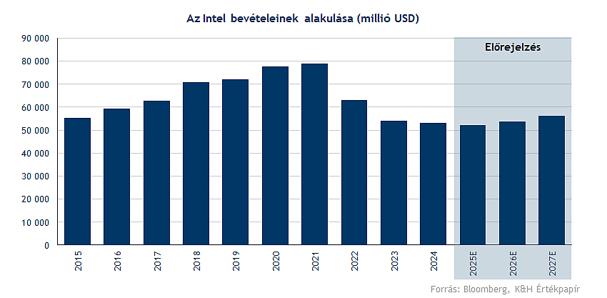 A chipgyártó bevételtermelése az utóbbi években csökkenő tendenciát mutatott, mivel a szektortársak erős alternatívákat kínáltak az Intel termékeivel szemben, így a gyengülő kereslet következtében a vállalat inkább lemaradónak számított az AI chipek versenyében. Az elmúlt két évben az éves bevételek 53– 54 milliárd dollárra estek vissza a 2021–2022-ben látott 63–74 milliárd dolláros szintekről. A Bloomberg konszenzusa szerint a csökkenés idén is folytatódhat, az éves bevétel várhatóan 52 milliárd dollár körül alakul, ami közel 2 százalékos éves visszaesést jelentene.