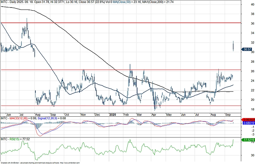 Egy hónappal ezelőtt, augusztus közepén, az állami befektetéssel kapcsolatos spekulatív hírek hatására nagyot ugrott az Intel árfolyama, és megjelent az aranykereszt képe is, az 50 napos mozgóátlag alulról keresztezte a 200 napos mozgóátlagot, megerősítve ezzel az emelkedő trendet. A tegnapi kereskedés során az RSI túlvett szintekre ugrott, míg az MACD nem adott egyértelmű jelzést.