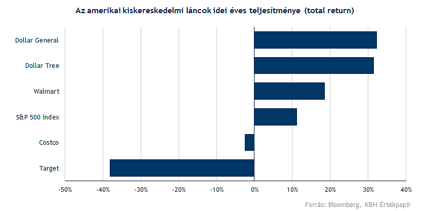 A tegnapi turbulens piaci környezetben is ellenállóságról tett tanúbizonyságot a Walmart, amely 6,5 százalékos pluszban zárt, ezzel pedig a legjobban teljesítő S&P 500 index komponensnek számított. Ráadásul a csúcsaitól sem áll távol az árfolyam, tehát látható módon az utóbbi időben is jól tartotta magát a papír, valamint év eleje óta is felülteljesítő tud lenni az amerikai részvényindexszel szemben. Ha csak a főbb iparági versenytársakat (Costco, Target) vizsgáljuk közelebbről, itt is szembetűnő a felülteljesítés a Walmart részéről, amely a javuló fundamentumoknak és a sikeresnek bizonyuló vezetőségi stratégiának is köszönhető.