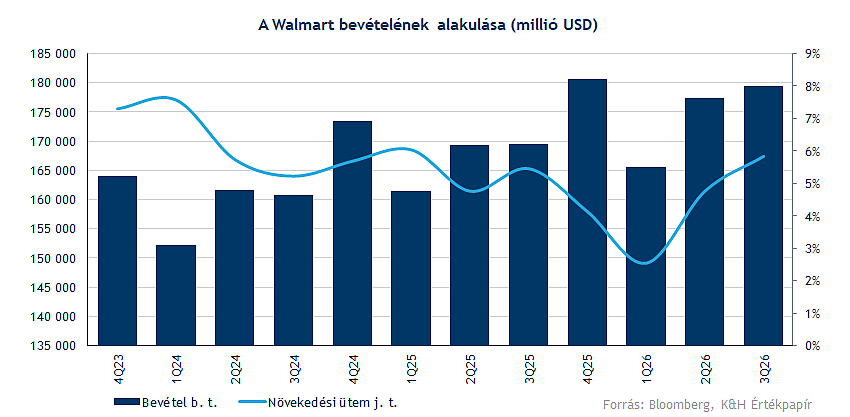 Az erős negyedéves számok így a 2026-os üzleti év előrejelzéseinek megemelésére sarkallták a vezetőséget. Bevételek tekintetében így 4,8-5,1 százalék körüli javulást jósol a menedzsment, amely érdemi változás a korábban bejelentett 3,75-4,75 százalékos várakozáshoz képest. Ezzel együtt a tisztított működési eredmény előrejelzésének alsó sávján is emelt a Walmart, valamint 2,58-2,63 dolláros EPS várakozást fogalmaztak meg.