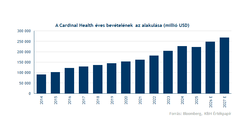 A Cardinal Health kapcsán fontos kiemelni, hogy az összbevételének közel 99 százaléka az Egyesült Államokból származik, így a vállalatot alig érintették a vámok. A cég június végén zárta le a 2025-ös üzleti évét, amelyben az éves bevétel 222,5 milliárd dollárt tett ki, ami a tavalyi értékhez képest nem mutatott érdemi változást. Az előrejelzések alapján viszont a következő években újra beindulhat a bevételnövekedés, a Bloomberg konszenzusa a következő években 248 milliárd, majd 268 milliárd dolláros éves bevételt prognosztizál.