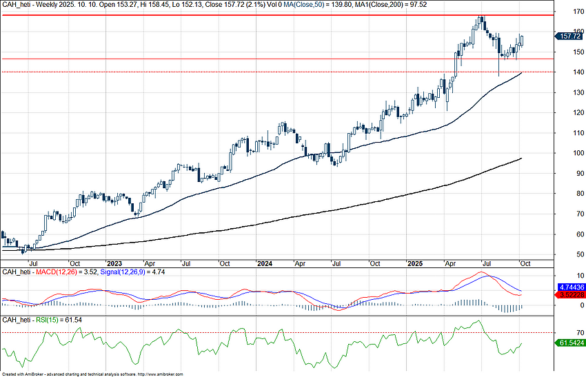 Egyelőre bőven felülteljesítőnek számít az egészségügyi cégek között a Cardinal Health részvénye az idei évben. A felülteljesítés mögött az is áll, hogy az amerikai cég bevételeinek túlnyomó része belföldről származik, így a vámok minimálisan érintették. A vállalat ennek köszönhetően folytatni tudta stratégiai terjeszkedését, az előrejelzések alapján pedig a következő években beindulhat a bevételnövekedés is. Technikailag kedvező szinteken mozog a részvény, az elemzők pedig kifejezetten optimisták a Cardinal Health kapcsán.