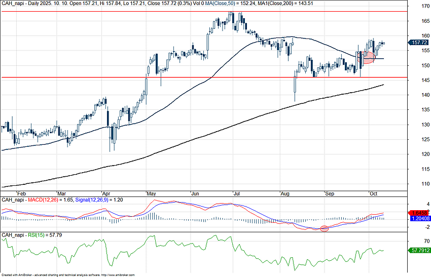 Technikailag is megfigyelhető a részvény idei erőteljes teljesítménye, júniusban új árfolyamcsúcsot ért el, ezt követően azonban a lendület megtorpant, és az augusztusi gyorsjelentést követően az árfolyam rövid ideig le is szúrt a 200 napos mozgóátlag közelébe. A 146 dolláros szint azonban erős támasznak bizonyult, így továbbra is érdemes ezt a szintet figyelemmel kísérni, míg szeptember végén áttörésre került az 50 napos mozgóátlag is, ami szintén támaszként szolgálhat a továbbiakban.