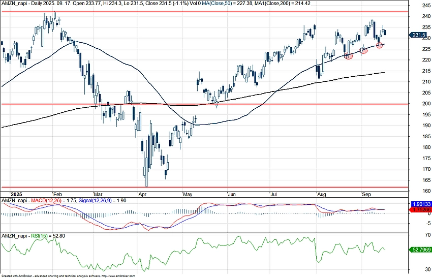 Jelenleg az emelkedő trend támogatja az Amazon árfolyamát, emellett az 50 napos mozgóátlag 227 dollárnál, illetve a 200 dolláros szint is védelmet nyújthat. Elsődleges ellenállásként a februári árfolyamcsúcs mutatkozik 243 dollár környékén, annak áttörése esetén megnyílhat a tér az árfolyam előtt.