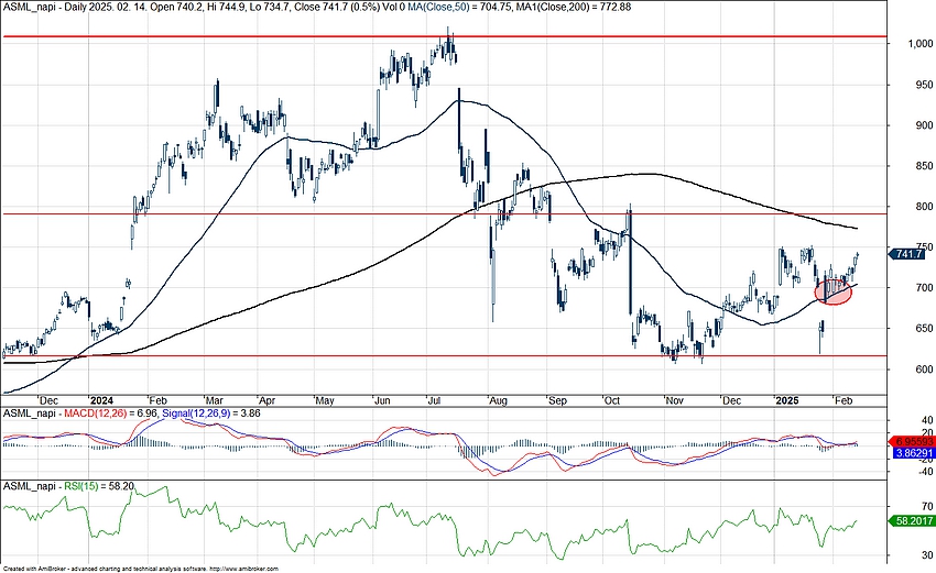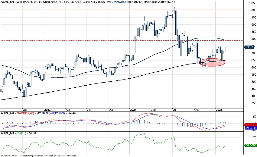 Az ASML árfolyama ideiglenesen a 200 hetes mozgóátlag alá süllyedt, de sikeresen visszapattant rövid időn belül. A január végi esés - amelyet a DeepSeek megjelenése okozott - erős támaszszintet jelölt ki. Az 50 hetes mozgóátlag (790 euró) fontos ellenállás lehet, októberben meg is próbálkozott ennek áttörésével a részvény, de nem járt sikerrel. Távolabbi cél az 1000 eurós szint lehet, de az jelentős felértékelődést igényelne a mostani árszinthez képest, de többek között a Goldman Sachs elemzője is 1010 eurós célárral számol. A technikai indikátorok közül az MACD vételi jelzést adott még korábban, és az RSI is visszatért a túladott tartományból.