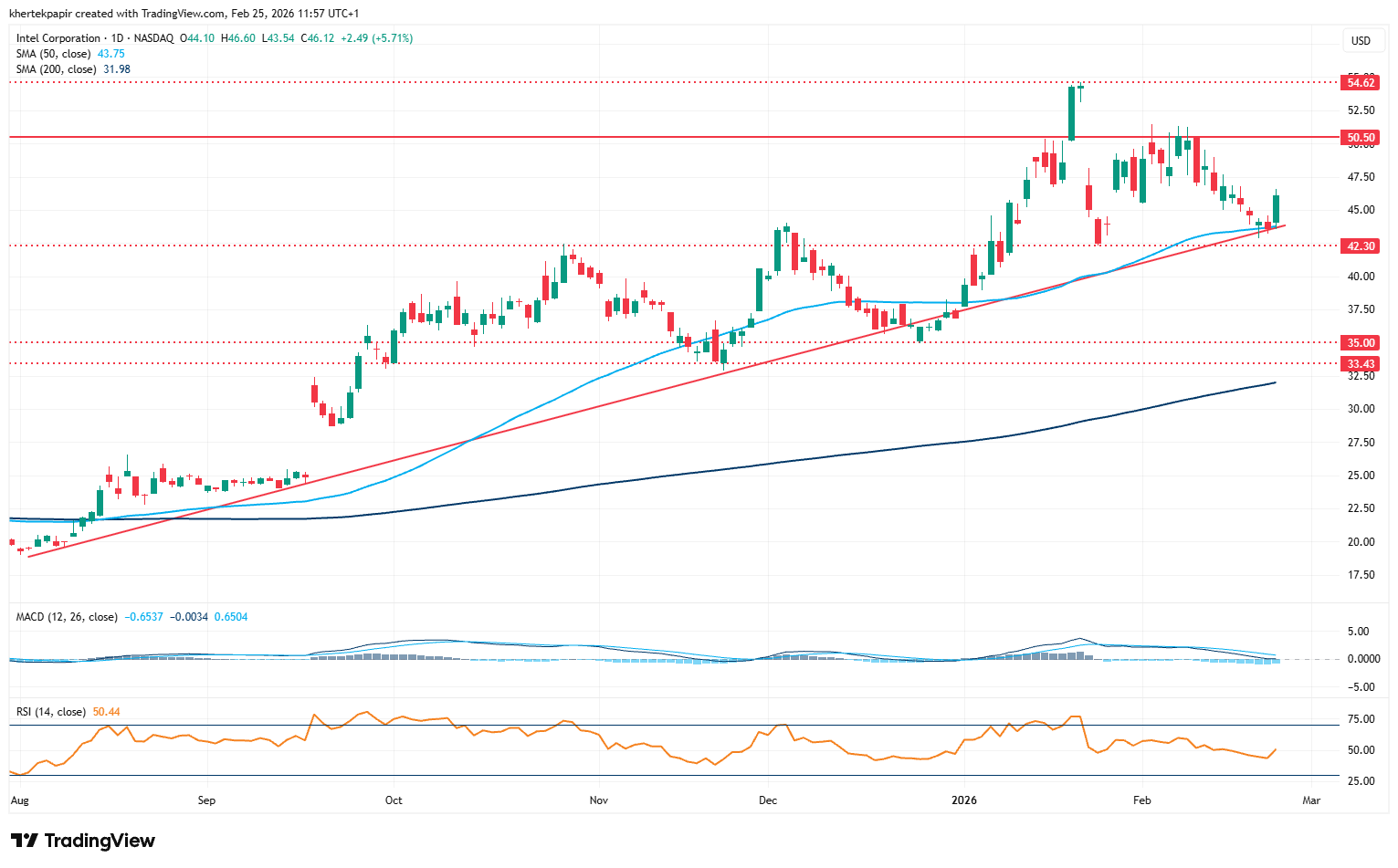 Az Intel napi grafikonja (2026. 02. 25. nyitás előtt)