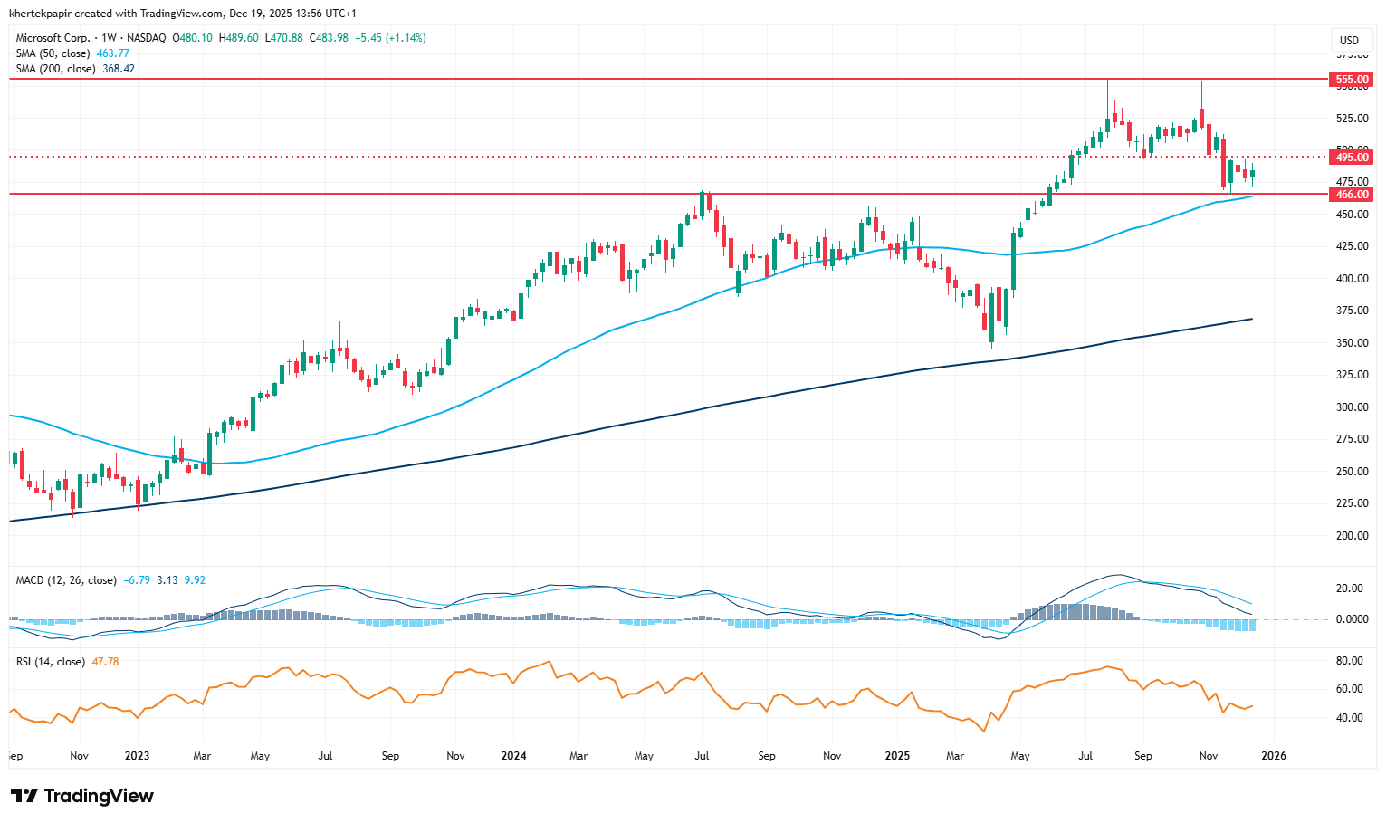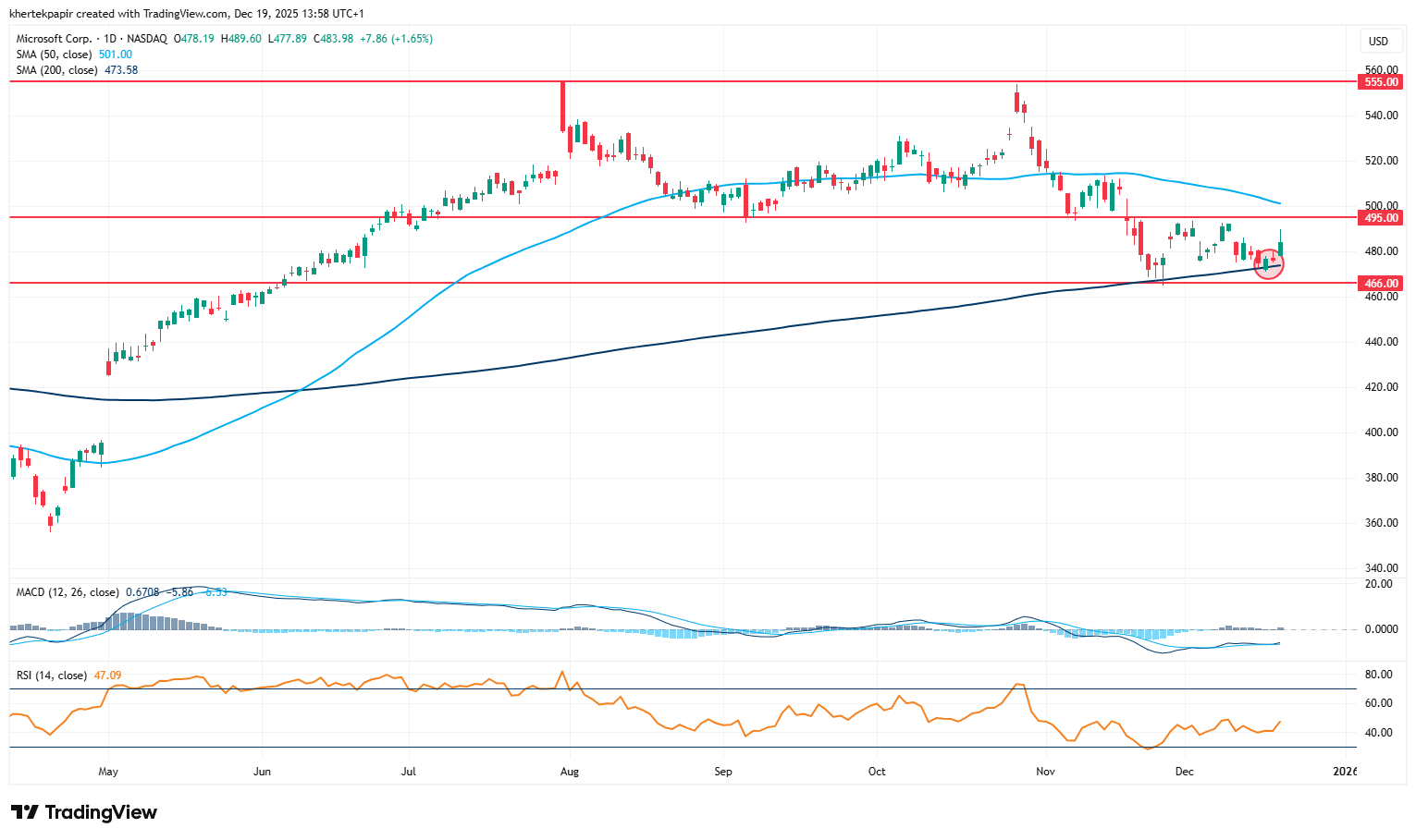 Nem teljesít kifejezetten erősen a Microsoft részvénye az október végi gyorsjelentés óta, a lendületvesztésben pedig szerepet játszott a technológiai szektor novemberi alulteljesítése is. Kissé ugyanis elromlott a befektetői hangulat a techrészények körül, újra felerősödtek a túlértékeltséggel és magas AI-beruházásokkal kapcsolatos aggodalmak a befektetők körében. Az elmúlt hetekben lejátszódott piaci korrekció közepette több részvény is újra vonzó szintekre került, ilyen például a Microsoft részvénye is, amelynek technikai képe a javuló piaci hangulatban éppen felpattanást mutat.