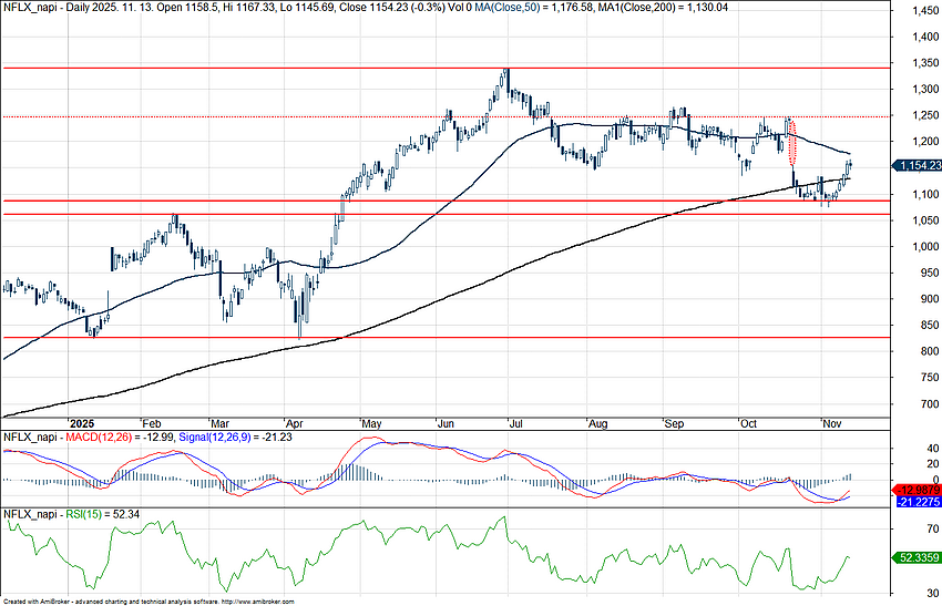 A negyedéves jelentést követően tehát beesett a részvény árfolyama, letörve ezzel az 1145 dollár körüli támaszzónát. Ezt további lecsorgás követte, viszont az 1070-1080 dollár körüli szintek megállították azt. Innen már újabb lendületre talált a Netflix részvénye az utóbbi napokban, ami még a gyengébb piaci hangulat közepette is tartani tudta magát.