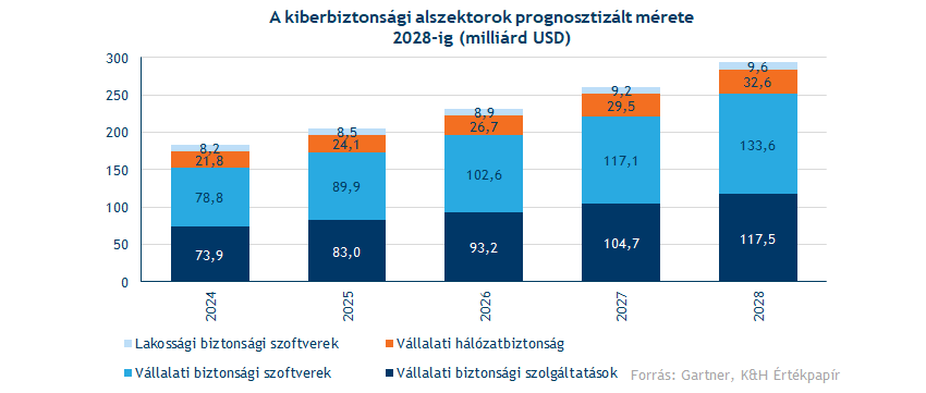 A fejlettebb biztonsági megoldások iránt továbbra is kiemelkedően erős a kereslet, amit a kiberbiztonsági cégek megrendelési mutatói és szolgáltatásaikból származó ismétlődő bevételei is alátámasztanak. A szektor teljes méretét a Gartner IT-tanácsadó cég 2024-ben 182 milliárd dollárra becsülte, és előrejelzésük szerint évi 12,5 százalékos összetett növekedési ütemmel (CAGR) 2028-ra meghaladhatja a 293 milliárd dollárt. Az egyes alszektorok közül a vállalati biztonsági szolgáltatások (pl. tanácsadás, sebezhetőségi vizsgálatok) 12 százalékos, a vállalati biztonsági szoftverek (pl. vírusirtók) 14 százalékos, míg a vállalati hálózatbiztonság (pl. VPN megoldások) 11 százalékos növekedés előtt állnak.