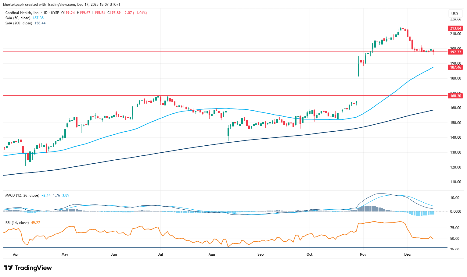 A Cardinal Health technikai képén szépen kirajzolódik az október végi jelentést követő kitörő befektetői reakció, ami egészen új tartományba repítette a részvényárfolyamot. A részvény új csúcsát 214 dollár környékén jelölte ki november végén, majd ezt egy kisebb korrekció követte egészen a 197 dolláros támaszszintig, amely jelenleg is megvédi az árfolyamot további visszaeséstől.